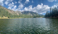 Potato Lake has many attributes that contribute to its allure as a tranquil paddle spot. The trail leads right to an easy launch spot on a gravelly shore. From the middle of the lake, a dramatic and varied panorama wraps around in all directions. To the north, modestly named Potato Hill towers 2000 feet above the water. To the east, the Twilight Peaks form a jagged skyline on the opposite side of Lime Creek's deep gorge. On the southwest, the lake is bounded by deep green spruce forest. And the lake itself features earthy shallows, dark blue depths, lilies at the east end and grasses in the west. Furthermore, there are scattered rocky perches around to lake's perimeter that offer unique perspectives down on the water and out to the surrounding mountains.